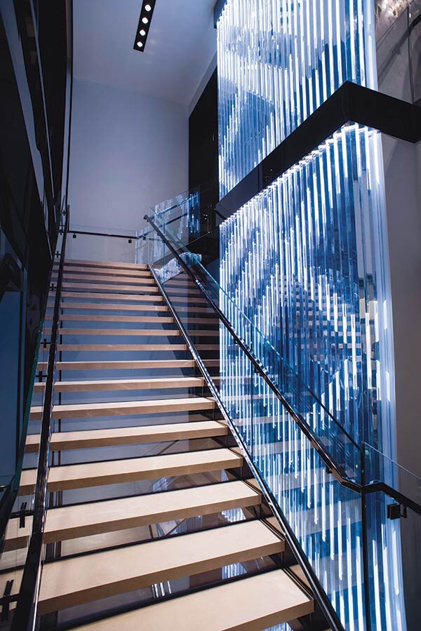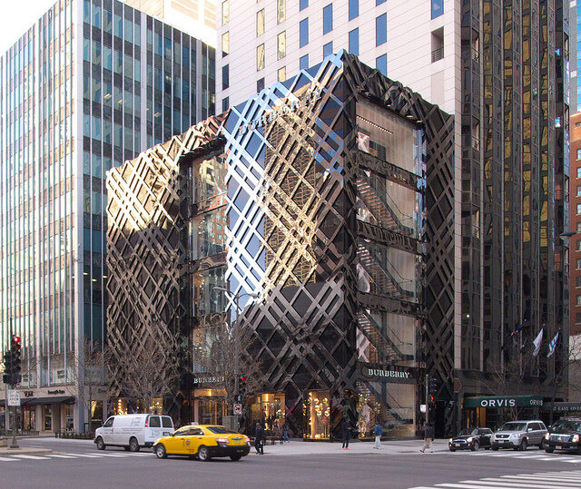 ミシガン アベニューにあるオンライン カジノ バカラ ストアの外壁は、黒いステンレス鋼、モノリシック スパンドレル ガラス、オンライン カジノ バカラの特徴的なタータン パターンを模倣するように設計された LED 照明の組み合わせです。高さ 8 フィートの内部階段も LED でバックライトが照らされており、夜間でも見ることができます。